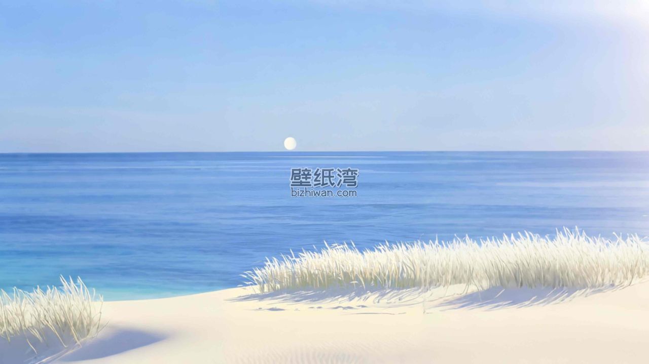 宁静海滩上芦苇,蔚蓝的大海,日出风景手机壁纸图片