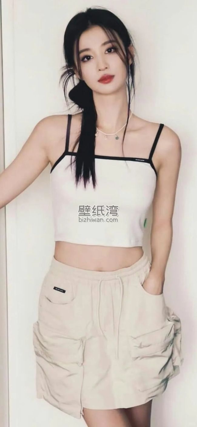 王楚然穿着白色吊带上衣和米色短裤,手机壁纸图片