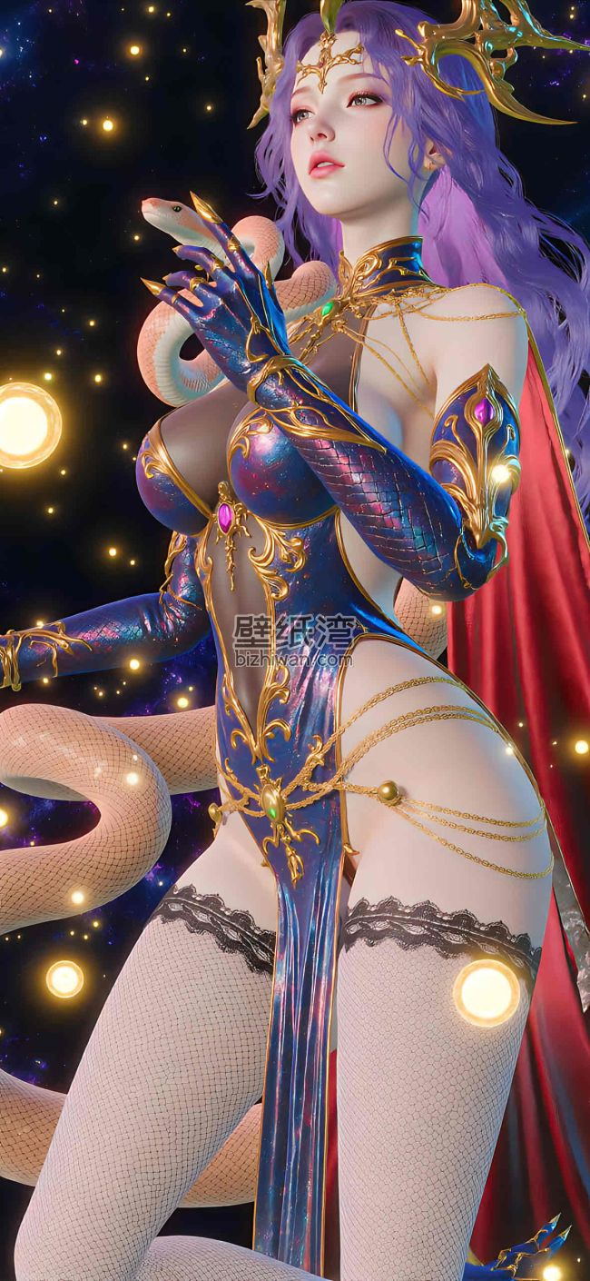 衣着华丽的性感动漫紫发美女与蛇缠绕在一起,星空背景手机壁纸图片