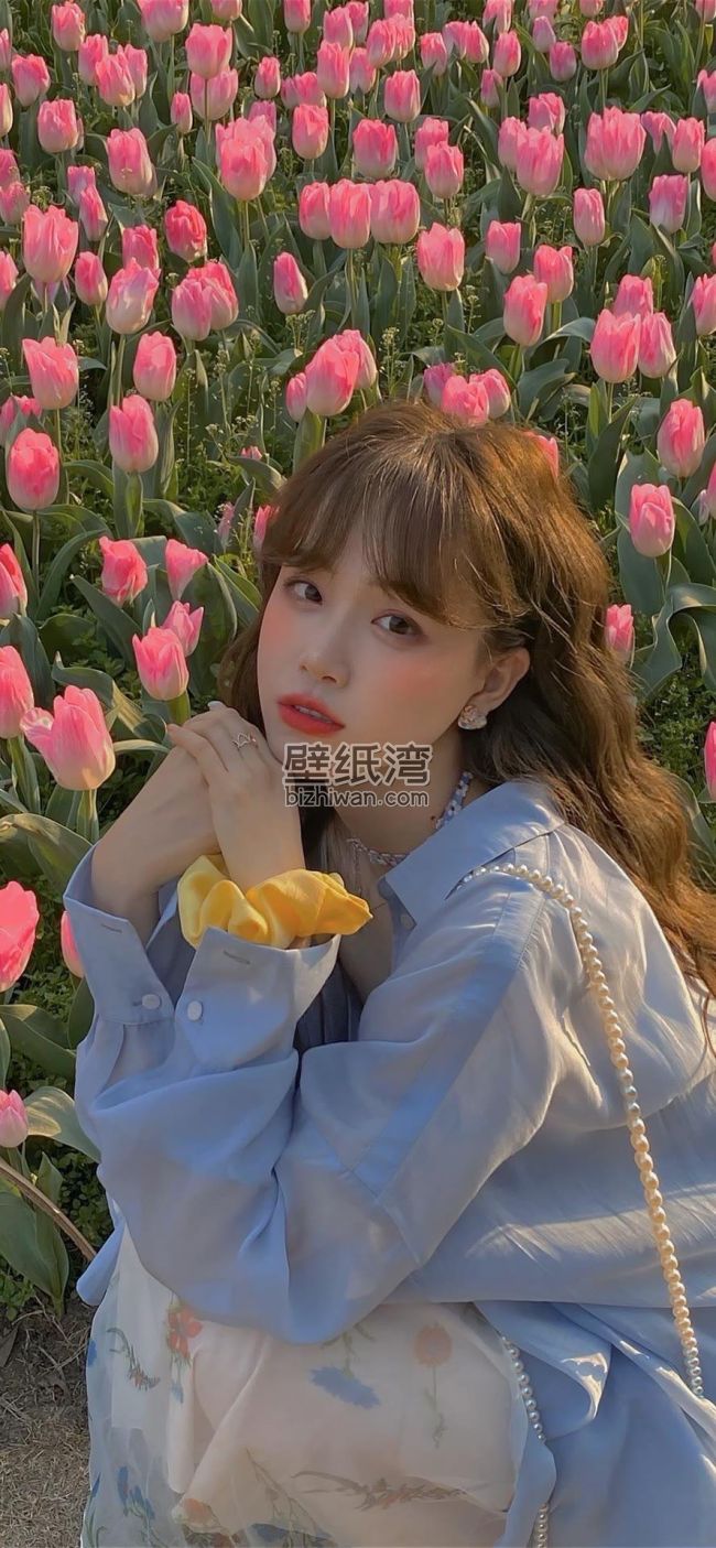 美女在郁金香花田中拍照,手机壁纸图片